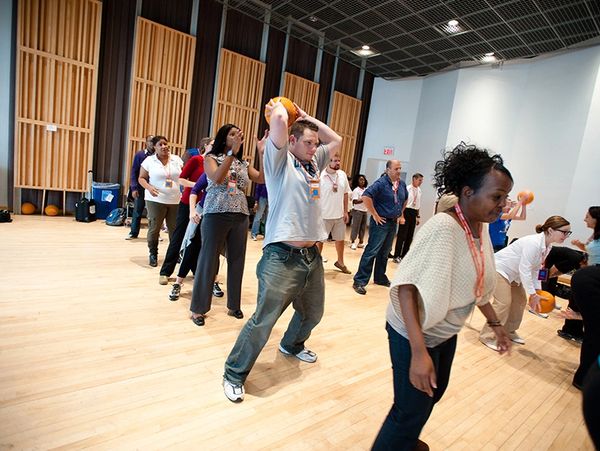 Have the group form a giant circle, holding hands. The game master then places 2 hula hoops on 2 people in the circle. The goal of this activity is to pass a hula hoops completely around the circle as quickly as possible without breaking handholds. When the music stops, the person with the hula hoop around them is out. Last person standing wins.