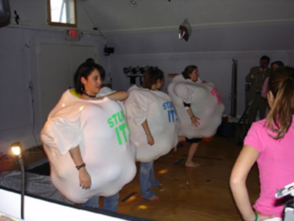 Groups are arranged in a line, one person in front of another. Place a balloon in-between each person, at chest height. The balloon is then held between everyone's torsos & backs. No hands or arms are allowed. The team them must walk from one end of the dance floor to the other and back without dropping any balloons. If a balloon does fall, the team must start over!