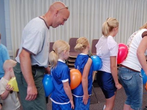All the kids will get into groups of 6. 1 person is the "stuffy" and the others are the "stuffers". The "stuffy" put on an oversized t-shirt, the "stuffers" are given balloons. The object is for the "stuffers" to blow up balloons and stuff them under the t-shirt of the "stuff". The team with the most balloons under the shirt in a given time wins! Time allotted game.