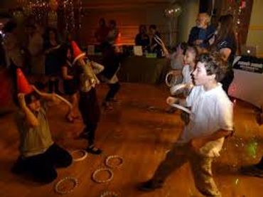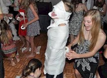 1 person is to be the Mummy and 2 or 4 are the wrappers. Four rolls of toilet paper are used. Wrappers run around and wrap the Mummy. At the Mitzvah, you can also include bows, ribbons, garland or whatever. Suggested Music: Thriller, Monster Mash